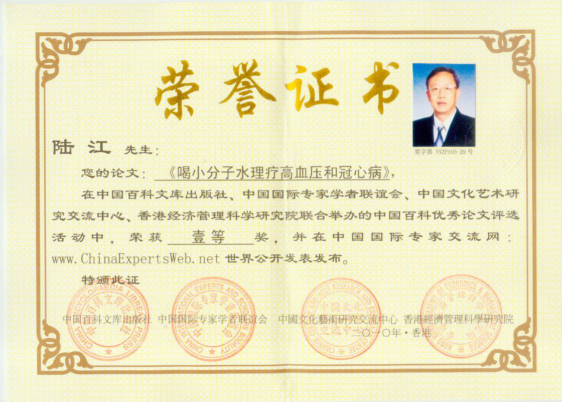 一.發明的亮點是中國基礎醫學研究成果的轉化醫學應用------------------------------------------------------------------------------------ 1990年春,我50歲,發現患了高血壓,便及時遵醫囑服藥。我想起父輩、祖輩曾患高血壓,后來都患中風癱瘓或心梗過世,所以心中壓力大。我夢想能根治高血壓,便研究醫學。當我檢索到中國基礎醫學研究成果,采用高脂餐和磁處理小分子團水飼喂小白鼠或大白免等兩組哺乳動物,經過2、4、6個月剖殺血檢,發現飼喂小分子團水的試驗組動脈內壁干凈,能減輕和延緩動脈粥樣硬化。我從這些研究成果受到啟發。覺得有責任研制出優良的器具,讓天下人能真正治愈高血壓,消除動脈粥樣硬化,延年益壽。于是,1990年我做成樣品,先后與愛人飲用兩三個月,分別治愈了高、低血壓,之后我們的血壓都正常,癥狀消失。該水經南京大學做核磁共振檢測為55.82赫茲的微小分子團水。該品經工業開發后,1994年送給廣西三家三甲醫院做臨床試用4個月,再經北京和廣西醫學專家鑒定認為:“降脂降壓效果好” ,“能擴大心腦動脈流量,改善心腦電圖和微循環” ,“對治療心腦動脈粥樣硬化、高血壓、高血脂有良好的醫療保健作用”。1996年產品獲得中國發明專利權。這就使產品可以轉化為醫學應用,人類可逐漸改變終生服藥,自己祛除病癥。